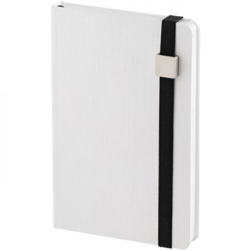 Блокнот с твердой обложкой, выполнен из материала Tex, белый. Дополнен цветной резинкой с металлическим шильдом и ляссе.