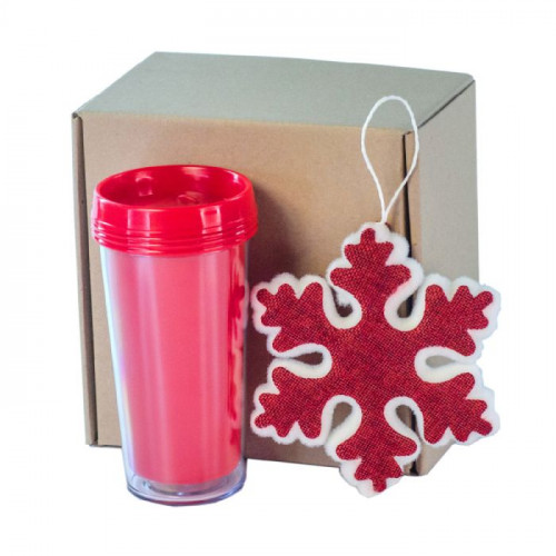 В набор входят: 6300137- Термостакан (кружка) из пластика, со съёмной полиграфической вставкой "Фрост", 473 мл, красный 2) 2830517 - Украшение новогоднее "Snowflake", цвет красный. 3) 5500549 - Коробка Spatium. 4) Наполнитель.