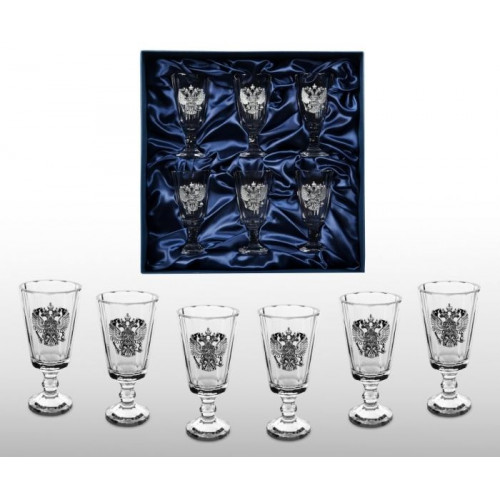 В состав наборавходит 6 хрустальных граненых лафитников емкостью 50 мл. с оловянными барельефами «Двуглавый орел». Материал барельефа: сплав с содержанием олова не менее 95%(пьютер). Художественное литье,чернение с эффектом антикварного серебра,полировка. Ручная работа. Солидная подарочная упаковка с атласным ложементом. В данном наборе рюмки изготовленны из хрусталя традиционной рецептуры с содержанием 24% PbO.