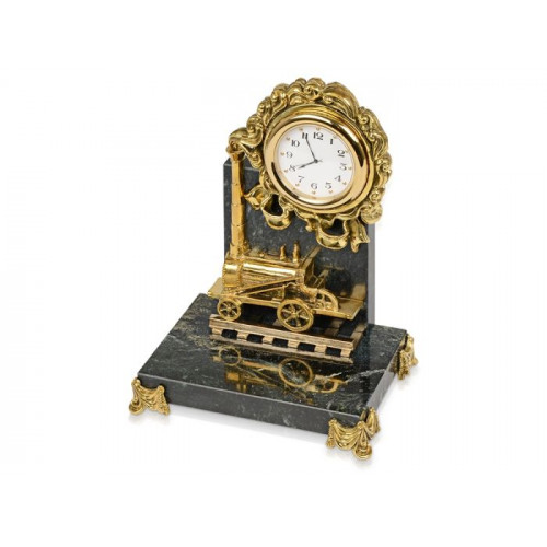Эксклюзивный подарок для представителей транспортных, железнодорожных и туристических компаний. Настольный прибор с часами на подставке украшен изображением самого первого паровоза. Набор обладает классическим сочетанием темно-зеленого и золотистого оттенков. Источник питания