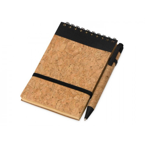 Оригинальный блокнот с обложкой из пробки и картона, а также блоком из переработанной бумаги. В комплекте черная шариковая ручка из пробки.